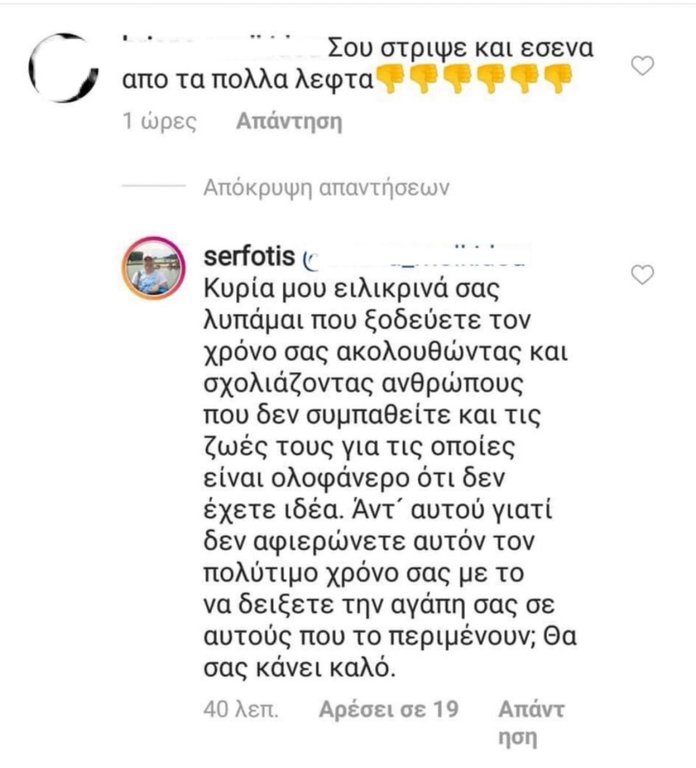 Η εν λόγω κυρία σχολίασε κάτω από μια φωτογραφία του από την Μύκονο όπου και κάνει τις διακοπές του: «Σου στριψε κι εσένα από τα πολλά λεφτά».