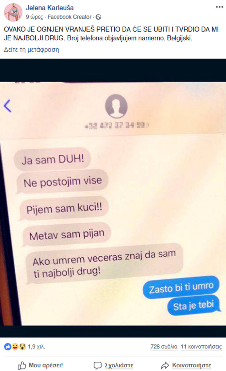 Αρχικά, ο Βόσνιος αστέρας «ανέβασε» μια ανάρτηση στο Instagram (την οποία στη συνέχεια «κατέβασε), με την οποία ανέφερε: «Αγαπητοί εκπρόσωποι των media. Αφήστε με να αναφέρω κάποια πράγματα για το ότι φέρεται να δέχθηκα απειλές τόσο εγώ όσο και η οικογένεια της κυρίας Καρλέουσα. Αφού δεν μπορούν να υπερασπιστούν τους εαυτούς τους και τις οικογένειές τους είμαι έτοιμος να πω την αλήθεια: