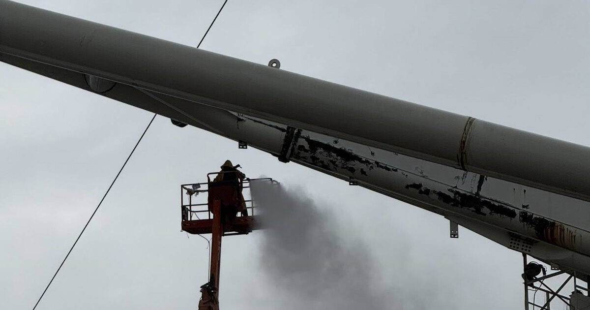 Παράλληλα, έχουν ξεκινήσει οι εργασίες υδροβολής στο κυρίως σώμα του στεγάστρου «Καλατράβα». Η διαδικασία περιλαμβάνει υδροβολή υψηλής πίεσης (Ultra High Pressure Water Jetting) με πίεση έως 2.500 bar, για την πλήρη απομάκρυνση παλαιών επιστρώσεων, οξειδώσεων και ρύπων από τις μεταλλικές επιφάνειες.