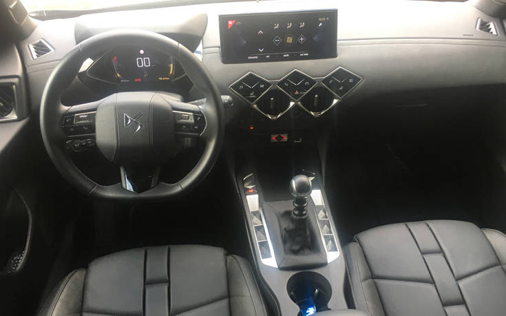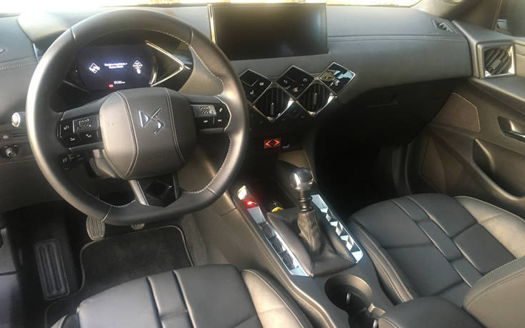 Το μεγάλο σοκ (ευχάριστο ή δυσάρεστο, είναι θέμα υποκειμενικό) όμως έρχεται όταν τραβήξεις αυτές τις χειρολαβές και δεις το …ρομβοειδές εσωτερικό. Η «υπογραφή» της μάρκας, ο ρόμβος, είναι παντού και χαρακτηρίζουν το σύνολο της σχεδίασης του εσωτερικού, εκτός από την παραλληλόγραμμη οθόνη 10.3 ιντσών του συστήματος πολυμέσων και τον κεντρικό πίνακα οργάνων μεγέθους 7 ιντσών. Η καμπίνα του DS3 Crossback, βρίθει σχεδιαστικών καινοτομιών, που αφενός ξαφνιάζουν και αφετέρου απαιτούν χρόνο για να συνηθίσεις και να χειριστείς ειδικά τα δευτερεύοντα χειριστήρια, χωρίς να βλέπεις.