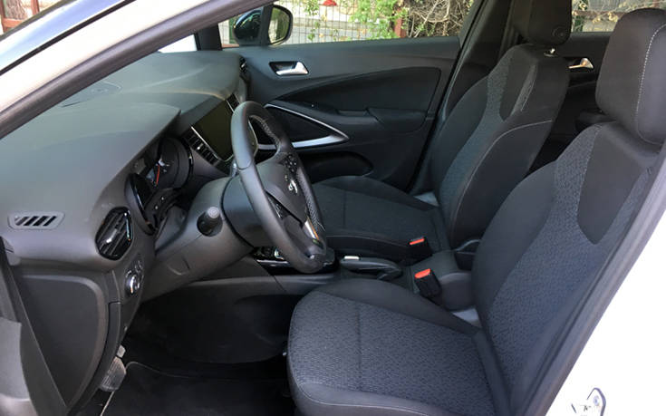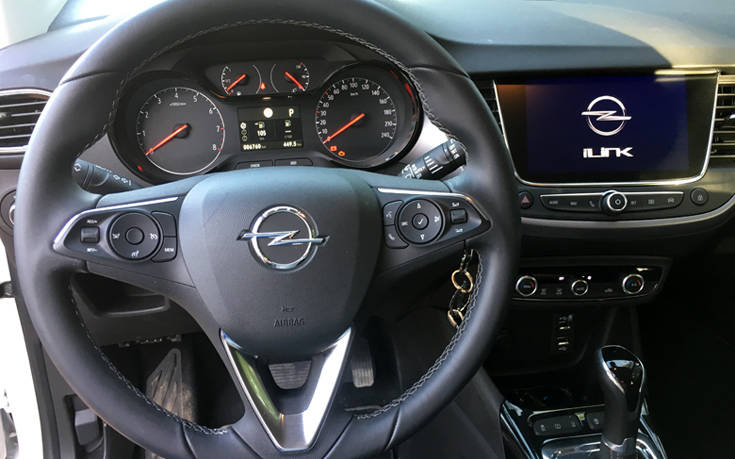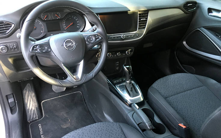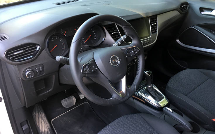 Με αυτήν την προσλαμβάνουσα, καθίσαμε επιφυλακτικά στην θέση του οδηγού, του δίχρωμου Crossland X με τον βενζινοκινητήρα 1200 κ.εκ. και το αυτόματο κιβώτιο 6 σχέσεων.
