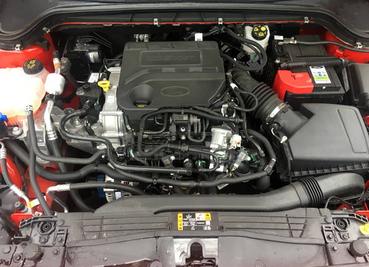 «Καρδιά» του Focus της δοκιμής μας, πολυβραβευμένος, 3κυλινδρος 1000άρης κινητήρας βενζίνης EcoBoost, με δυνατότητα απενεργοποίησης κυλίνδρου. Με μόλις 999 κ.εκ. αποδίδει 125 ίππους στις 6000 στροφές και 170 Nm ροπής, διαθέσιμα από τις 1.400 έως τις 4.500 σ.α.λ.! Χωρίς κραδασμούς, ή ενοχλητικό κροτάλισμα, ο κινητήρας αυτός ξεκινά να «φορτώνει» από τις 1500 στροφές, για να «απογειωθεί» μετά τις 2000 σαλ, έως σχεδόν τον κόφτη. Συνδυάζεται με ένα χειροκίνητοι 6άρι κιβώτιο, με άριστη κλιμάκωση και υποδειγματική λειτουργία χρήσης.