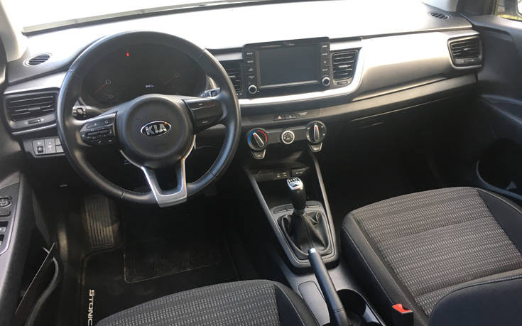 Το με ευχάριστη και εργονομική σχεδίαση εσωτερικό, χωρά άνετα 4 ενήλικες και με στρίμωγμα ένα πέμπτο. Τα υλικά επένδυσης είναι μεν σκληρά, αλλά δείχνουν ποιοτικά, ανθεκτικά και άψογα συναρμολογημένα (το Stonic κατασκευάζεται στην Ν. Κορέα). Οι αποθηκευτικοί χώροι για μικροαντικείμενα θεωρούνται επαρκείς και ο εξοπλισμός για το Stonic σχεδόν πλούσιος από την βασική έκδοση. Ο πίνακας οργάνων διαθέτει αναλογικές και ψηφιακές ενδείξεις, ενώ η ψυχαγωγία- ενημέρωση-πλοήγηση γίνεται από την έγχρωμη οθόνη 7’’ που με σύστημα Apple CarPlay & Android Auto συνδέονται με τα «έξυπνα» κινητά (με θύρες συνδεσιμότητας ακόμα και πίσω στην πιο πλούσια έκδοση).