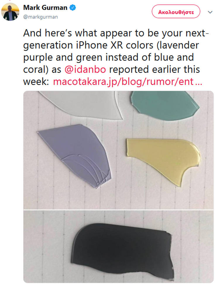 Όσον αφορά τα χρώματα των smartphones, και εκεί φαίνεται ότι θα υπάρξει αλλαγή, καθώς ενδέχεται να καταργηθεί το περσινό μπλε και στην παλέτα θα προστεθούν ένα μωβ και ένα πράσινο. Μάλιστα, μια φημολογία θέλει το μήλο (δηλαδή το σήμα) να επανέρχεται στα χρώματα του ουράνιου τόξου.