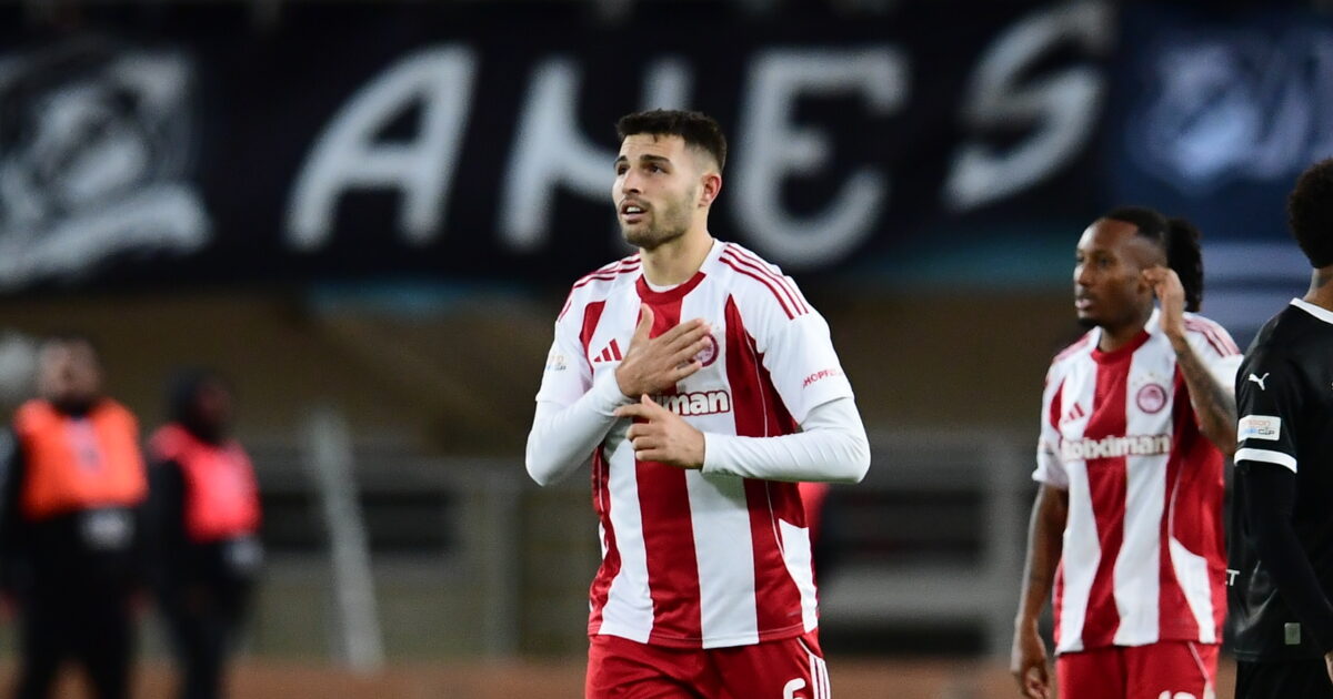 Ο Καλογερόπουλος αφού κέρδισε το πέναλτι που έδωσε την ευκαιρία στον Ταρέμι να κάνει το 1-0 στο Ολυμπιακός – ΟΦΗ, με κεφαλιά έκανε το 2-0.