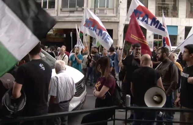 Στο σημείο βρίσκονται δυνάμεις των ΜΑΤ, ενώ από τους διαδηλωτές ακούγονται συνθήματα υπέρ της Παλαιστίνης, καταδικάζοντας όσα διαδραματίζονται στη Γάζα.