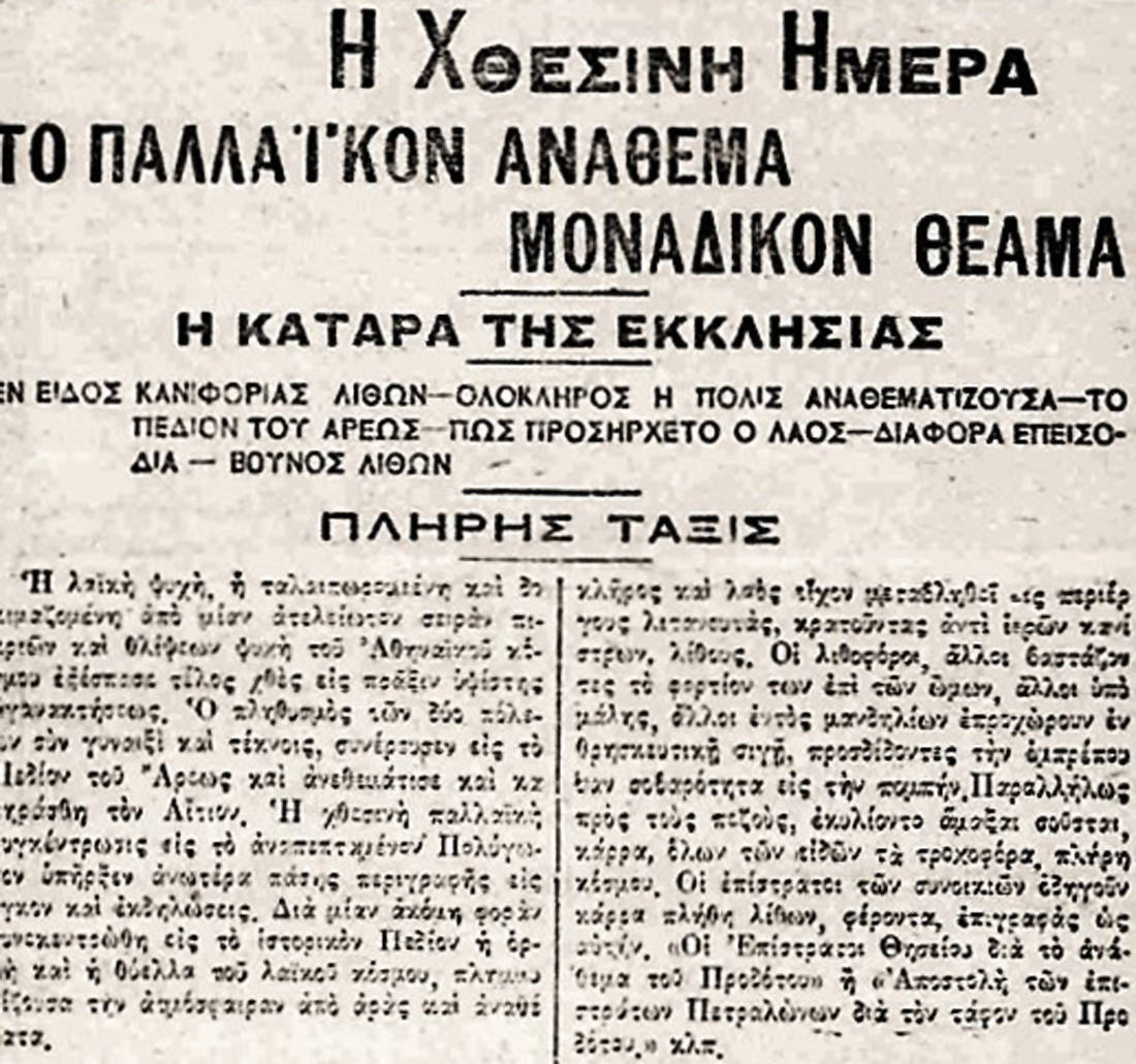 Πρώτος ξεκίνησε ο μητροπολίτης Αθηνών Θεόκλητος. «Κατά Ελευθερίου Βενιζέλου φυλακίσαντος αρχιερείς και επιβουλευθέντος την βασιλείαν και την πατρίδα ανάθεμα έστω» λέει, παίρνει τέσσερις πέτρες τις ρίχνει μέσα σε ένα λάκκο που είχε ανοιχθεί και φωνάζει: «ανάθεμα και τρις ανάθεμα»!