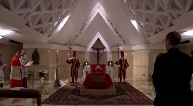 Η σορός του Πάπα Φραγκίσκου κείτεται σε ένα ξύλινο, ανοικτό φέρετρο, στο παρεκκλήσι του ξενώνα Σάντα Μάρτα, εκεί όπου προσευχόταν τα τελευταία 12 χρόνια της ζωής του.