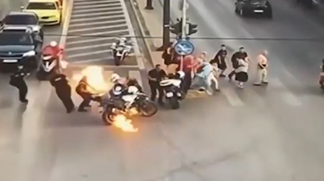 Μία υπηρεσιακή μοτοσικλέτα τυλίγεται στις φλόγες, ενώ έντρομοι αστυνομικοί και πολίτες προσπαθούν να απομακρυνθούν από το σημείο. Από καθαρή τύχη δεν τραυματίζεται κανείς.