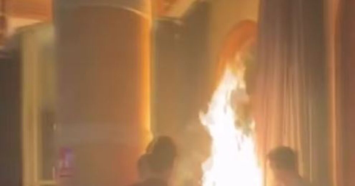 Στα πλάνα διακρίνεται μια κουρτίνα να παίρνει φωτιά τη στιγμή που πελάτες του εστιατορίου κρατούν πυροτεχνήματα εσωτερικού χώρου και τα κραδαίνουν στον ρυθμό της μουσικής, την ώρα που χορεύτριες παρουσιάζουν ένα σόου πάνω στο μπαρ.