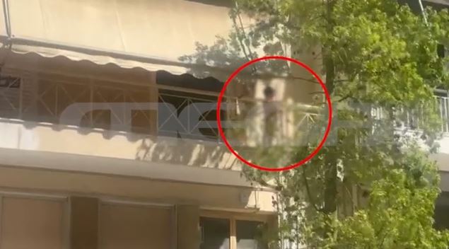 Η αστυνομικός κρατιέται από έναν σωλήνα στον εξωτερικό τοίχο της πολυκατοικίας και πατάει στους ώμους συναδέλφου της που την κρατάει. Ρισκάρει τη ζωή της.