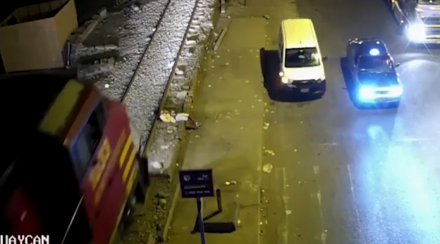 Στις 4 το πρωί οι κάμερες ασφαλείας καταγράφουν την στιγμή που το τρένο πλησιάζει και τον στριφογυρίζει στις ράγες, ευτυχώς χωρίς να τον τραυματίσει θανάσιμα.