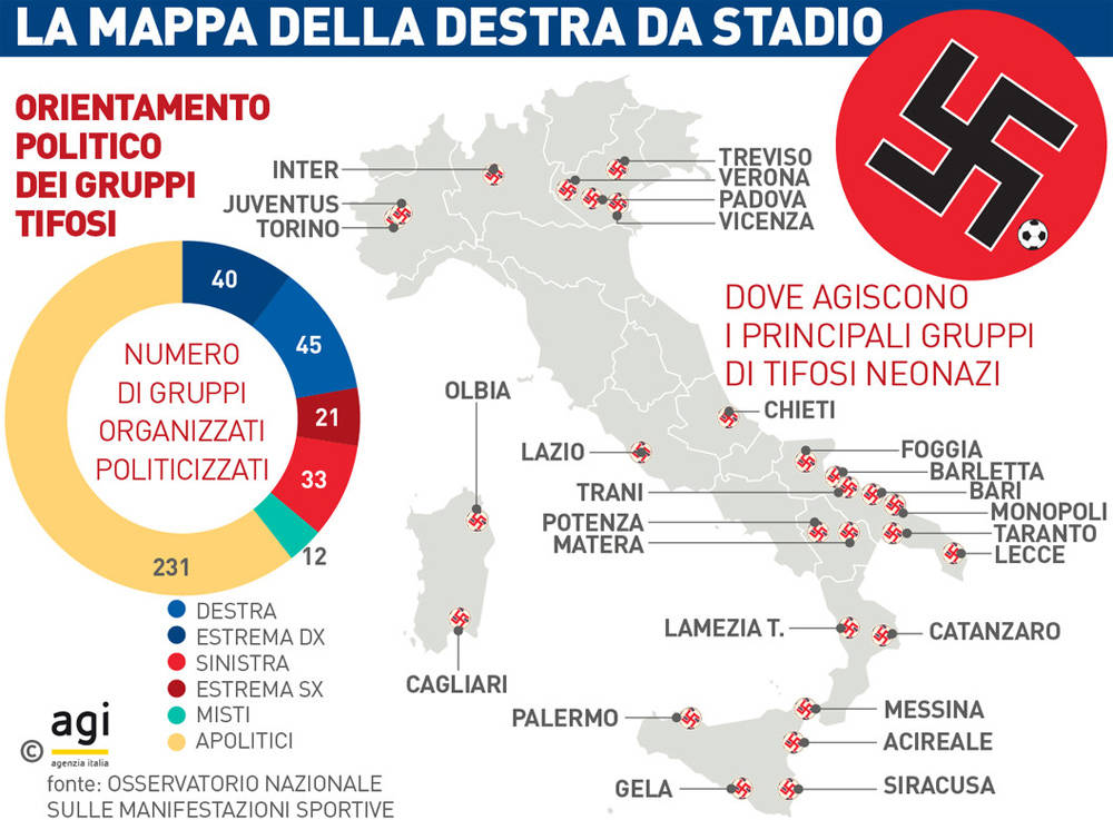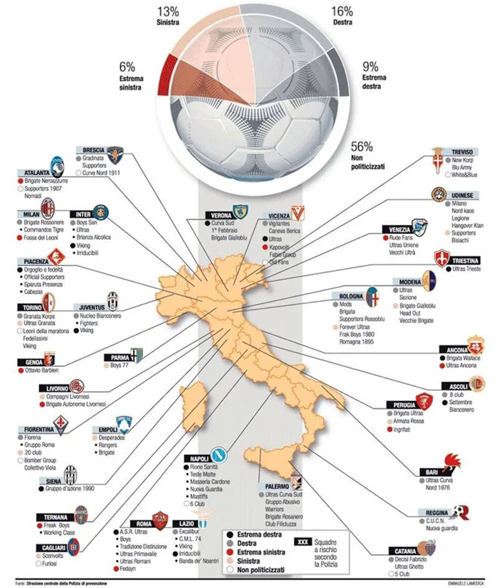 Επιγραμματικά, σύμφωνα με την έρευνα αυτήν, τα στοιχεία δείχνουν ότι στην Ιταλία υπάρχουν 328 γκρουπ οπαδών, από τα οποία τα 151 είναι προσανατολισμένα και πολιτικά. Από αυτούς τους συνδέσμους οι 40 «ανήκουν» στη Δεξιά, οι 45 στην Άκρα Δεξιά, οι 33 στην Αριστερά και οι 21 στη Ριζοσπαστική Αριστερά. Οι υπόλοιποι ανήκουν σε χώρους πιο κεντρώους, αλλά γενικώς είναι πιο μετριοπαθείς στον τρόπο που εκφράζονται στις κερκίδες.