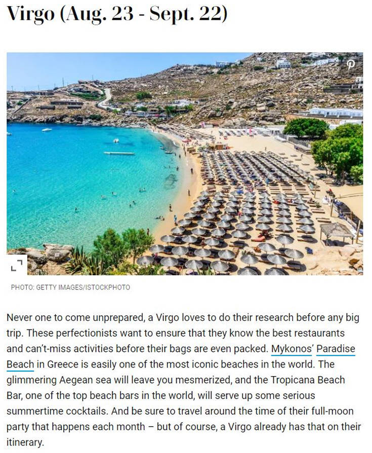 Αυτή δεν είναι άλλη από την παραλία Super Paradise, στην κοσμοπολίτικη Μύκονο, η οποία προτείνεται για τους Παρθένους. Πρόκειται για τους τελειομανείς ταξιδιώτες που δεν φεύγουν ποτέ απροετοίμαστοι από την βάση τους, έχοντας κάνει ολοκληρωμένη έρευνα πριν από κάθε ταξίδι τους, εξασφαλίζοντας ότι έχουν συγκεντρώσει τα καλύτερα της περιοχής που επισκέπτονται.