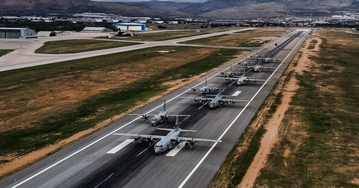 Το ένα μετά το άλλο, πέντε μεταγωγικά αεροσκάφη τύπου C-130 και πέντε C-27J της Πολεμικής Αεροπορίας άρχισαν να τροχοδρομούν για να παραταχθούν πάνω στον διάδρομο απογείωσης, παρουσία του υπουργού Εθνικής Άμυνας Νίκου Δένδια και του Α/ΓΕΑ Αντιπτεράρχου Δημοσθένη Γρηγοριάδη.