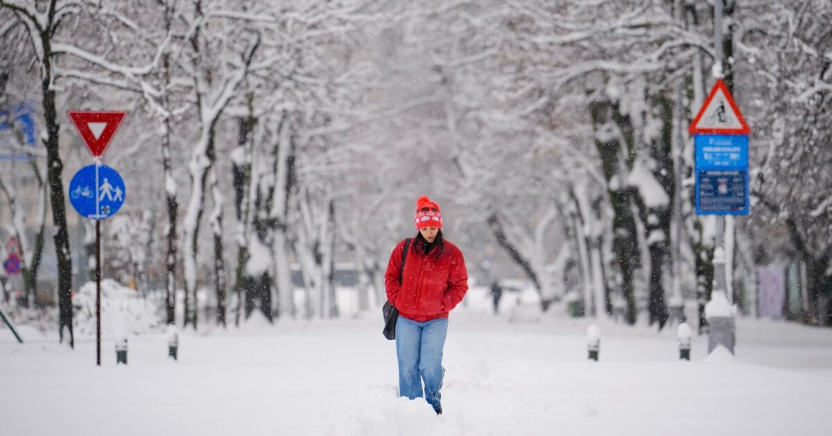 A woman trudges through snow after a blizzard in Bucharest, Romania, Wednesday, Feb. 18, 2026. (AP Photo/Vadim Ghirda)