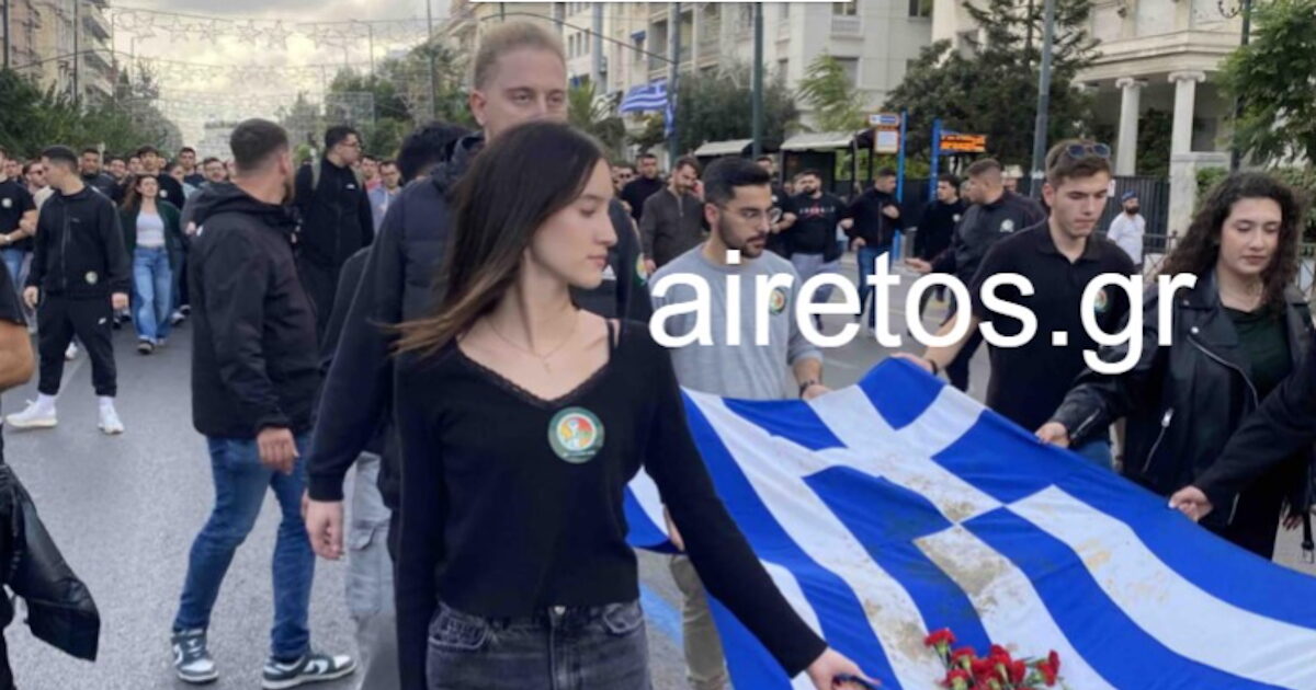 «Στην κορυφή της πορείας για την 52η επέτειο του Πολυτεχνείου βρέθηκε φέτος η Κατερίνα Γεννηματά-Τσούνη, κρατώντας με το αριστερό της χέρι το ένα άκρο της αιματοβαμμένης ελληνικής σημαίας.