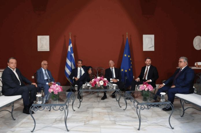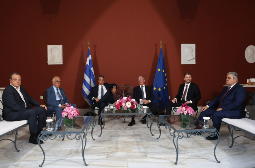 Κώστας Τασούλας, Κυριάκος Μητσοτάκης και Νικήτας Κακλαμάνης κάθισαν μόλις για μισή ώρα με τους Νίκο Ανδρουλάκη, Σωκράτη Φάμελλο και Δημήτρη Κουτσούμπα με τον πρωθυπουργό να μην κρύβει την ενόχλησή του για τους χαρακτηρισμούς των πολιτικών του αντιπάλων.