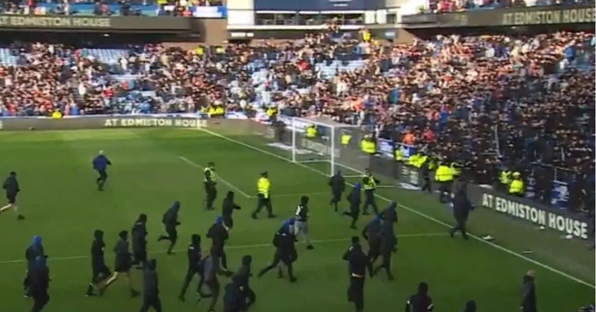 Chaos at Ibrox as fans from both sides storm the pitch following the Hoops’ dramatic penalty shootout victory