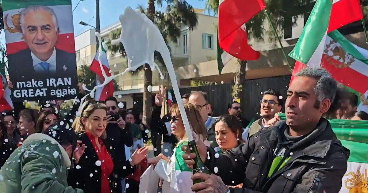 Οι διαδηλωτές, αντίπαλοι του καθεστώτος του Χαμενεΐ, άνοιξαν σαμπάνιες, χορεύουν δυτικά τραγούδια και ζητούν με συνθήματα να κλείσει η πρεσβεία του Ιράν.
