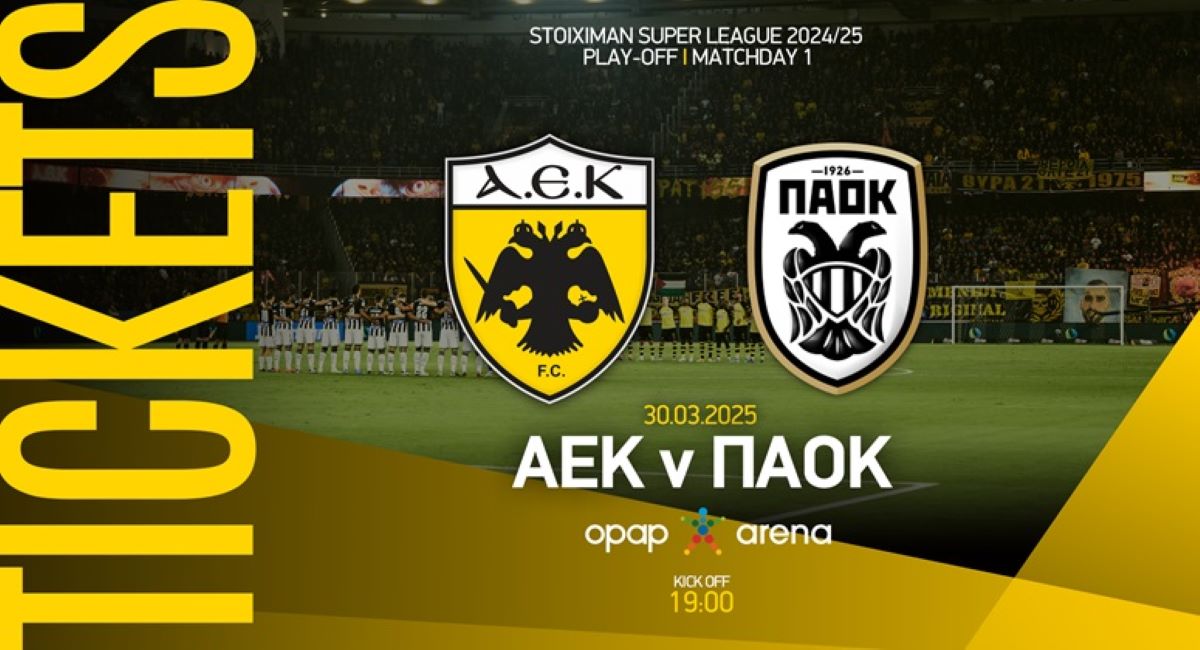 «Η ΠΑΕ ΑΕΚ ανακοινώνει ότι έχουν τεθεί προς διάθεση τα εισιτήρια για το παιχνίδι της 1ης αγωνιστικής των Playoffs της Super League απέναντι στον ΠΑΟΚ, που θα διεξαχθεί την Κυριακή 30 Μαρτίου στις 19:00, στην OPAP Arena.