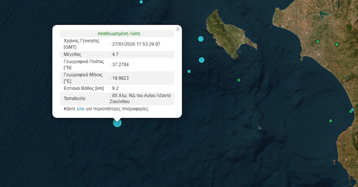 Σεισμός μεγέθους 4,7 Ρίχτερ σημειώθηκε το βράδυ της Τρίτης (27.01.2026) στη Ζάκυνθο.