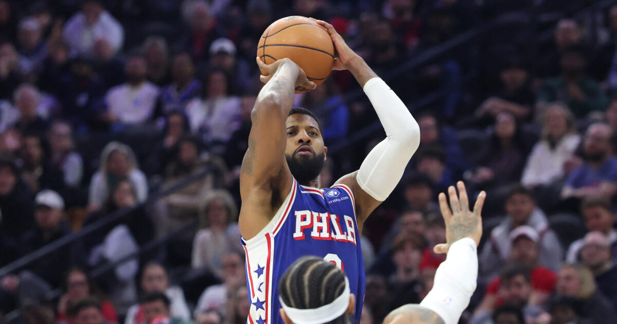 Ο Πολ Τζορτζ με τη φανέλα των Σίξερς/ Mandatory Credit: Bill Streicher-Imagn Images