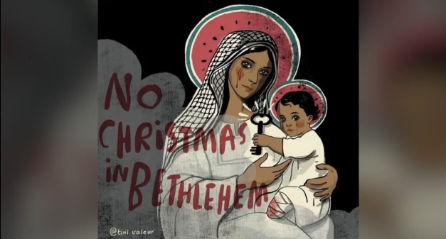 Το παιδί έχει ακρωτηριασμένο πόδι ενώ με κόκκινα γράμματα αναφέρεται «No Christmas in Bethleem», μια αναφορά στον πόλεμο Παλαιστινίων και Ισραηλινών.