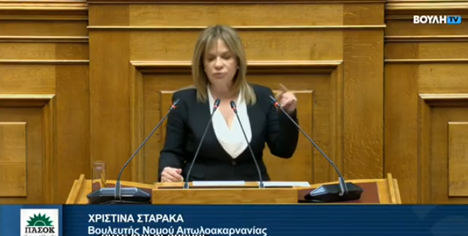 Σκληρή και ιδιαίτερα δεικτική ήταν η κριτική της βουλευτής του ΠΑΣΟΚ κ. Χριστίνας Σταρακά στην ομιλία της στη βουλή στην ολομέλεια σε συζήτηση για νομοσχέδιο του υπουργείου Οικονομικών.
