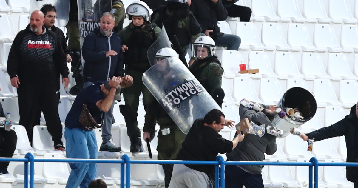 Στη συνέχεια, ομάδα περίπου δέκα ατόμων από τους οπαδούς του Ιωνικού άρχισε να πετά αντικείμενα, όπως μπουκάλια και καθίσματα.