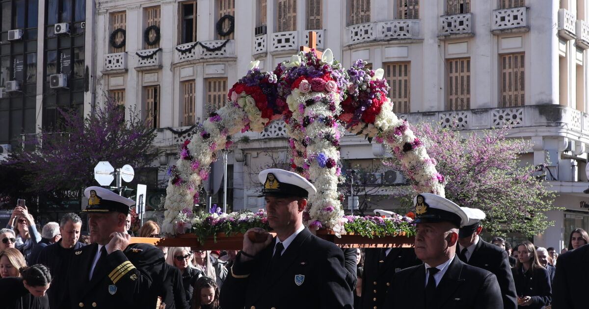 Μυροφόρες έριχναν άνθη στον Επιτάφιο, ενώ αξιωματικοί του Ναυτικού τον μετέφεραν, συνοδευόμενοι από προσκόπους και μέλη του Ερυθρού Σταυρού. Πλήθος πιστών ακολούθησε την πομπή, με τις καμπάνες να ηχούν πένθιμα σε όλο το κέντρο.