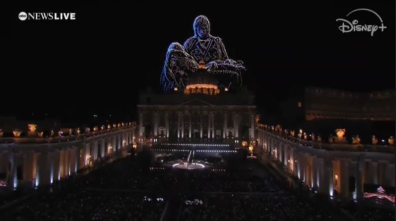 Με την βοήθεια drones, η μορφή του Πάπα Φραγκίσκου φώτισε τον ουρανό της Ρώμης επάνω από το Βατικανό.