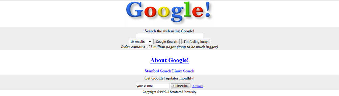 Το ημερολόγιο έγραφε 27 Σεπτεμβρίου 1998 όταν αυτό το παράξενο λογότυπο μιας ακόμα πιο παράξενης ως όνομα μηχανής αναζήτησης θα ανέβαινε online. Όλα ξεκίνησαν το 1995, όταν κάποιος Larry Page, που είχε αποφοιτήσει μόλις από το Πανεπιστήμιο του Μίσιγκαν, επισκέπτεται το περίφημο Στάνφορντ και η μοίρα το θέλει να τον ξεναγεί στο πανεπιστήμιο κάποιος Sergey Brin.