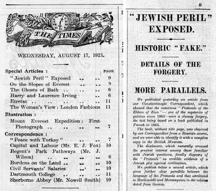 Ο δημοσιογράφος αποκάλυψε πως τα «Πρωτόκολλα» δεν ήταν έργο μιας μυστηριώδους εβραϊκής σέχτας, αλλά σε πολλά σημεία ήταν πιστή αντιγραφή ενός βιβλίου του 1864. Του Maurice Joly συγκεκριμένα, ο οποίος δεν είχε μάλιστα τους εβραίους κατά νου, αλλά ήθελε να ασκήσει κριτική στις πολιτικές του Ναπολέοντα Γ’. Τα «Πρωτόκολλα» περιέχουν 160 αυτούσια τμήματα του «Dialogue in Hell» και του φανταστικού διαλόγου μεταξύ Μακιαβέλι και Μοντεσκιέ που περιγράφει το σατιρικό πόνημα του Joly, αντικαθιστώντας απλώς το «Ναπολέων» με το «εβραίοι».