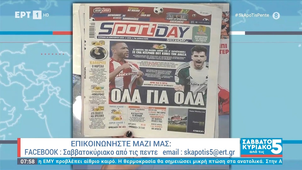 Στην ποδοσφαιρική δράση είναι στραμμένα όλα τα βλέμματα. Η μάχη στο πρωτάθλημα έχει… φουντώσει και αυτό κυριαρχεί στα πρωτοσέλιδα των αθλητικών εφημερίδων. Η ΑΕΚ επικράτησε χθες (25/1) του Παναιτωλικού με 1-0 στη Νέα Φιλαδέλφεια, με τον Μαρσιάλ να κρίνει το αποτέλεσμα της αναμέτρησης. Το ρεπορτάζ του αγώνα βρίσκεται στα πρώτα φύλλα, ενώ δεσπόζει η προαναγγελία για το αποψινό ντέρμπι “αιωνίων” ανάμεσα σε Ολυμπιακό και Παναθηναϊκό στο “Γεώργιος Καραϊσκάκης” (20:30, ΕΡΑ ΣΠΟΡ).