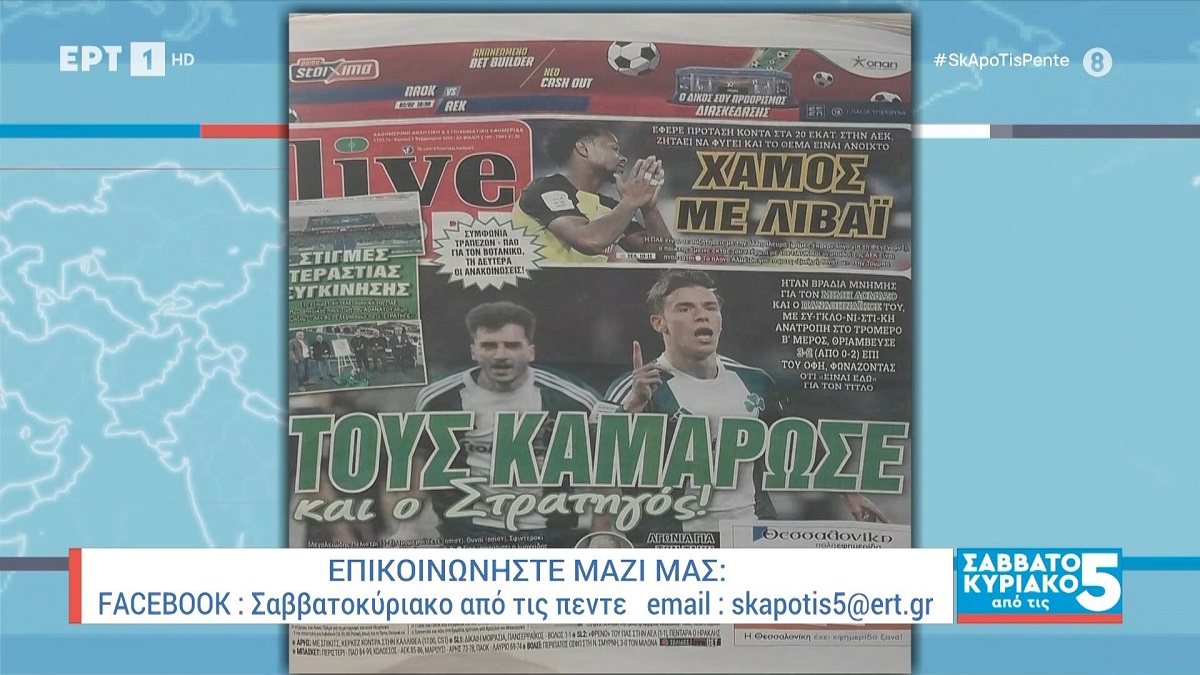 Η 21η αγωνιστική του πρωταθλήματος της Super League ξεχωρίζει στα πρωτοσέλιδα των αθλητικών εφημερίδων. Ιδιαίτερη αναφορά γίνεται στη χθεσινή (1/2) μεγάλη ανατροπή του Παναθηναϊκού, ο οποίος έχανε 0-2 στο ΟΑΚΑ από τον ΟΦΗ, αλλά τελικά επικράτησε με 3-2. Επιπλέον, σημαντικό ενδιαφέρον υπάρχει και για το ρεπορτάζ των σημερινών (2/2) αναμετρήσεων, αφού ο πρωτοπόρος Ολυμπιακός δοκιμάζεται στην έδρα του Λεβαδειακού, ενώ ο ΠΑΟΚ φιλοξενεί στην Τούμπα την ΑΕΚ στο ντέρμπι της αγωνιστικής. Φυσικά, απασχολεί έντονα και το τι συμβαίνει με τον Λιβάι Γκαρσία, ο οποίος δεν θα αγωνιστεί, καθώς υπάρχει μεγάλη πρόταση από ομάδα του εξωτερικού.//Ν.