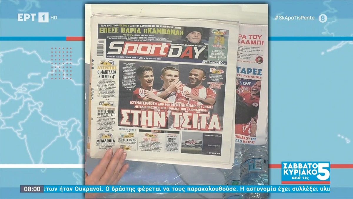 Τα πρωτοσέλιδα ασχολούνται με την χθεσινή νίκη της ΑΕΚ, η οποία επικράτησε με 2-1 του Ατρομήτου στην άδεια “OPAP Arena” με γκολ του Μάνταλου στις καθυστερήσεις και ανέβηκε προσωρινά στην κορυφή της βαθμολογίας. Εκεί θέλει να επιστρέψει ο Ολυμπιακός που αντιμετωπίζει εκτός έδρας τον Πανσερραϊκό (17:00, ΕΡΑ ΣΠΟΡ), ενώ ο Παναθηναϊκός υποδέχεται τον Βόλο (17:00, ΕΡΑ ΣΠΟΡ) και δεν θέλει άλλη απώλεια βαθμών. Το ίδιο ισχύει και για τον ΠΑΟΚ που φιλοξενεί την ουραγό Λαμία (20:00, ΕΡΑ ΣΠΟΡ), ενώ αναφορά γίνεται και στο μπάσκετ, καθώς κοντράρονται Ολυμπιακός και Παναθηναϊκός (20:15, ΕΡΤ3) για τον τίτλο του Κυπελλούχου Ελλάδος για το 2025.//Ν.