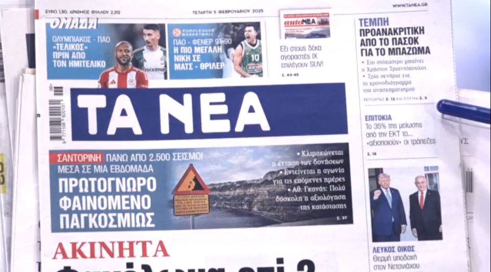 Αρχική ΕΛΛΑΔΑ Τα πρωτοσέλιδα των εφημερίδων σήμερα ΕΛΛΑΔΑ Τα πρωτοσέλιδα των εφημερίδων σήμερα Από Adieksodos - 5 Φεβρουαρίου 2025 Κοινοποίηση FacebookTwitterPinterestLinkedin 1 5.jpg Πηγή ΠΑΡΟΜΟΙΑ ΑΡΘΡΑΠΕΡΙΣΣΟΤΕΡΑ ΑΠΟ ΤΟΝ ΔΗΜΙΟΥΡΓΟ Καιρός αύριο: Η κακοκαιρία Byron φέρνει βροχές, καταιγίδες και ισχυρούς ανέμους – Έντονα φαινόμενα σε Αττική και Θεσσαλονίκη Σπύρος Μαρτίκας: Φίλος του τον διαψεύδει για την συμμορία των καζίνο – «Δεν γνωρίζω τα μέλη του κυκλώματος, του δάνεισα 200.000 ευρώ ως δάνειο» Κακοκαιρία Byron: Νόμιμη η απουσία των δημοσίων υπαλλήλων που δεν θα μπορούν να προσέλθουν την Παρασκευή Βόλος: Κρατούμενος απείλησε, χτύπησε και δάγκωσε αστυνομικούς – Χρειάστηκαν 4 άτομα για να του βάλουν χειροπέδες Κακοκαιρία Byron: Κλειστές την Παρασκευή (5/12/25) οι εκπαιδευτικές δομές και οι βρεφονηπιακοί σταθμοί της ΔΥΠΑ στην Περιφέρεια Αττικής Πάτρα: Συνελήφθησαν οι ανήλικοι που ξυλοκόπησαν τον 12χρονο και το κατέγραψαν σε βίντεο Καιρός αύριο: Η κακοκαιρία Byron φέρνει βροχές, καταιγίδες και ισχυρούς ανέμους... 5 Δεκεμβρίου 2025 Η Φεντερίκα Μογκερίνι μίλησε με πλήρη διαφάνεια και με ηρεμία στις... 5 Δεκεμβρίου 2025 Στον αέρα το Ολυμπιακός – Φενέρμπαχτσε: Νερά στο παρκέ του ΣΕΦ 5 Δεκεμβρίου 2025 Ευρυδίκη Βαλαβάνη: «Προσπαθώ να θηλάσω αλλά είναι το πιο δύσκολο κομμάτι» 5 Δεκεμβρίου 2025 Κύπελλο Ελλάδας Betsson: Η βαθμολογία μετά την ολοκλήρωση της 4ης αγωνιστικής 5 Δεκεμβρίου 2025 Σπύρος Μαρτίκας: Φίλος του τον διαψεύδει για την συμμορία των καζίνο... 5 Δεκεμβρίου 2025 Ο Πούτιν «ηθικά υπεύθυνος» για την διαρροή του Νόβιτσοκ που δηλητηρίασε... 5 Δεκεμβρίου 2025 Αναβλήθηκε το Ολυμπιακός – Φενέρμπαχτσε εξαιτίας της κακοκαιρίας Byron 5 Δεκεμβρίου 2025 Βασίλης Μπισμπίκης: «Ήθελα να έχω μια φωλιά, που να αράζουμε με... 5 Δεκεμβρίου 2025 Κακοκαιρία Byron: Νόμιμη η απουσία των δημοσίων υπαλλήλων που δεν θα... 5 Δεκεμβρίου 2025