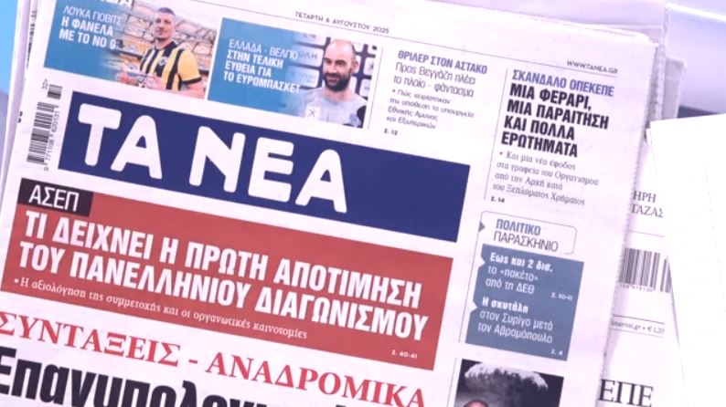 Αρχική ΕΛΛΑΔΑ Τα πρωτοσέλιδα των εφημερίδων σήμερα ΕΛΛΑΔΑ Τα πρωτοσέλιδα των εφημερίδων σήμερα Από Adieksodos - 6 Αυγούστου 2025 Κοινοποίηση FacebookTwitterPinterestLinkedin 6.jpg Τι γράφουν οι εφημερίδες σήμερα 06/08/2025. Πηγή ΠΑΡΟΜΟΙΑ ΑΡΘΡΑΠΕΡΙΣΣΟΤΕΡΑ ΑΠΟ ΤΟΝ ΔΗΜΙΟΥΡΓΟ Πώς δρούσε η εγκληματική οργάνωση που ανάγκαζε παιδιά να πουλούν λαθραία τσιγάρα: Τα κρατούσαν σε υπόγεια και τα χτύπαγαν Κακοκαιρία Byron: Βροχές μεγάλης έντασης και διάρκειας θα χτυπήσουν 8 περιοχές – Επικαιροποιήθηκε ξανά το έκτακτο δελτίο Η κακοκαιρία Byron σαρώνει και το Ηράκλειο: Ανεμοστρόβιλος χτύπησε τον Τσούτσουρο – Υπερχείλισε ρέμα Καιρός – Τσατραφύλλιας: Η κακοκαιρία δεν έχει τελειώσει – Τα 7 σημεία που παραμένουν στο επίκεντρο Αγροτικά μπλόκα: Νέες κινητοποιήσεις σε «Πράσινα Φανάρια» και κόμβο Δερβενίου – Πάνω από 6.000 τρακτέρ στους δρόμους Χίος: Δραματική διάσωση μητέρας και γιου μετά από φωτιά σε σπίτι – Συγκλονιστικό βίντεο Πώς δρούσε η εγκληματική οργάνωση που ανάγκαζε παιδιά να πουλούν λαθραία... 5 Δεκεμβρίου 2025 Προπονητής Μπράιτον για τον Στέφανο Τζίμα: «Θα μείνει εκτός για μήνες» 5 Δεκεμβρίου 2025 Μιχάλης Ιατρόπουλος: «Δεν έχω κανένα άγχος γιατί δεν ζω από το... 5 Δεκεμβρίου 2025 Δικαστήριο στη Γαλλία αποφασίζει το μέλλον της Shein – Η κυβέρνηση... 5 Δεκεμβρίου 2025 Αγορά ακινήτου με δάνειο: Οι τιμές διαμερισμάτων και οι μηνιαίες δόσεις... 5 Δεκεμβρίου 2025 Η Παυλοπούλου πέρασε στα ημιτελικά των 200μ. μεικτής του Ευρωπαϊκού πρωταθλήματος... 5 Δεκεμβρίου 2025 Σοφία Παυλίδου: «Είμαι σε σχέση. Είμαι ευτυχισμένη, ερωτευμένη» 5 Δεκεμβρίου 2025 Κακοκαιρία Byron: Βροχές μεγάλης έντασης και διάρκειας θα χτυπήσουν 8 περιοχές... 5 Δεκεμβρίου 2025 Μέγκαν Μαρκλ: Οι γιατροί ακρωτηρίασαν το πόδι του πατέρα της, κινδύνεψε... 5 Δεκεμβρίου 2025 Χαμός στην Τουρκία: Συνελήφθησαν παίκτες της Φενερμπαχτσέ και της Γαλατασαράι για... 5 Δεκεμβρίου 2025