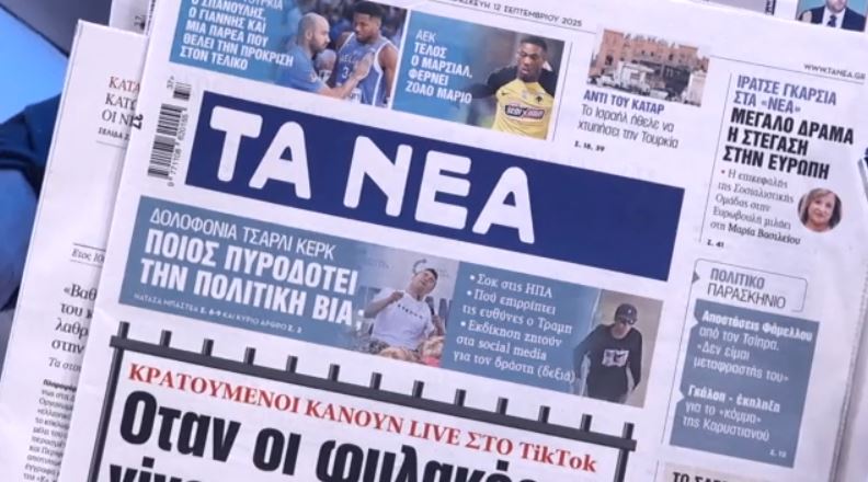 Αρχική ΕΛΛΑΔΑ Τα πρωτοσέλιδα των εφημερίδων σήμερα ΕΛΛΑΔΑ Τα πρωτοσέλιδα των εφημερίδων σήμερα Από Adieksodos - 12 Σεπτεμβρίου 2025 Κοινοποίηση FacebookTwitterPinterestLinkedin Capture 112.jpg Τι γράφουν οι εφημερίδες σήμερα 12/09/2025. Πηγή ΠΑΡΟΜΟΙΑ ΑΡΘΡΑΠΕΡΙΣΣΟΤΕΡΑ ΑΠΟ ΤΟΝ ΔΗΜΙΟΥΡΓΟ Αγροτικά μπλόκα: Νέες κινητοποιήσεις σε «Πράσινα Φανάρια» και κόμβο Δερβενίου – Πάνω από 6.000 τρακτέρ στους δρόμους Χίος: Δραματική διάσωση μητέρας και γιου μετά από φωτιά σε σπίτι – Συγκλονιστικό βίντεο Κακοκαιρία Byron: Από μία λωρίδα η κυκλοφορία στη νέα εθνική Αθηνών – Κορίνθου – Ποιοι δρόμοι έχουν κλείσει Κακοκαιρία Byron: Σε Βλυχάδα και Αυλώνα έπεσαν τα μεγαλύτερα ύψη βροχής Η κακοκαιρία Byron «έπνιξε» Μάνδρα, Μέγαρα και Νέα Πέραμο – Βίντεο με τους ορμητικούς χειμάρρους Καιρός: Σφοδρές καταιγίδες από την κακοκαιρία Byron – Οι 10 περιοχές που βρίσκονται στο επίκεντρο Συμφωνία 3,9 δισ. ευρώ για κέντρο τεχνητής νοημοσύνης της OpenAI στο... 5 Δεκεμβρίου 2025 Ολυμπιακός: Ο Άλβαρο Ρούμπιο είναι ο εκλεκτός για προπονητής της Β’... 5 Δεκεμβρίου 2025 Αγροτικά μπλόκα: Νέες κινητοποιήσεις σε «Πράσινα Φανάρια» και κόμβο Δερβενίου –... 5 Δεκεμβρίου 2025 Στέλιος Διονυσίου: Η μεγάλη του κόρη έκλεισε τα 20 και είναι... 5 Δεκεμβρίου 2025 Versace: Αποχωρεί ο καλλιτεχνικός διευθυντής Ντάριο Βιτάλε λίγο μετά την εξαγορά... 5 Δεκεμβρίου 2025 Καταπέλτης ο Αλέκος Αλαβάνος για τον Αλέξη Τσίπρα: «Έπρεπε να γονατίσει... 5 Δεκεμβρίου 2025 Χίος: Δραματική διάσωση μητέρας και γιου μετά από φωτιά σε σπίτι... 5 Δεκεμβρίου 2025 Τρόμος στη Βραζιλία: Airbus με 180 επιβάτες τυλίχθηκε στις φλόγες 5 Δεκεμβρίου 2025 Παναθηναϊκός – Βαλένθια: Για την πέμπτη διαδοχική νίκη στη Euroleague οι... 5 Δεκεμβρίου 2025 Κωνσταντίνος Αργυρός για Κίμπερλι Γκίλφοϊλ: Αυτό που μου έκανε εντύπωση είναι... 5 Δεκεμβρίου 2025