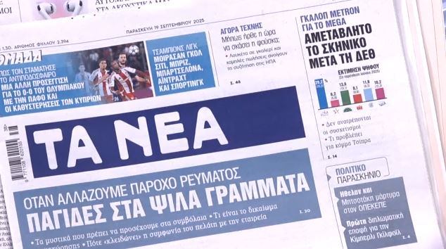 Αρχική ΕΛΛΑΔΑ Τα πρωτοσέλιδα των εφημερίδων σήμερα ΕΛΛΑΔΑ Τα πρωτοσέλιδα των εφημερίδων σήμερα Από Adieksodos - 19 Σεπτεμβρίου 2025 Κοινοποίηση FacebookTwitterPinterestLinkedin Capture 198.jpg Τι γράφουν οι εφημερίδες σήμερα 19/09/2025. Πηγή ΠΑΡΟΜΟΙΑ ΑΡΘΡΑΠΕΡΙΣΣΟΤΕΡΑ ΑΠΟ ΤΟΝ ΔΗΜΙΟΥΡΓΟ Καιρός – Τσατραφύλλιας: Η κακοκαιρία δεν έχει τελειώσει – Τα 7 σημεία που παραμένουν στο επίκεντρο Αγροτικά μπλόκα: Νέες κινητοποιήσεις σε «Πράσινα Φανάρια» και κόμβο Δερβενίου – Πάνω από 6.000 τρακτέρ στους δρόμους Χίος: Δραματική διάσωση μητέρας και γιου μετά από φωτιά σε σπίτι – Συγκλονιστικό βίντεο Κακοκαιρία Byron: Από μία λωρίδα η κυκλοφορία στη νέα εθνική Αθηνών – Κορίνθου – Ποιοι δρόμοι έχουν κλείσει Κακοκαιρία Byron: Σε Βλυχάδα και Αυλώνα έπεσαν τα μεγαλύτερα ύψη βροχής Η κακοκαιρία Byron «έπνιξε» Μάνδρα, Μέγαρα και Νέα Πέραμο – Βίντεο με τους ορμητικούς χειμάρρους Καιρός – Τσατραφύλλιας: Η κακοκαιρία δεν έχει τελειώσει – Τα 7... 5 Δεκεμβρίου 2025 Ο Μαδούρο τρέμει για τη ζωή του και αλλάζει συνεχώς κρεβάτια... 5 Δεκεμβρίου 2025 Η ΑΕΚ δεν ξεχνά τον Στέβαν Γέλοβατς: «4 χρόνια και είναι... 5 Δεκεμβρίου 2025 Η Κιμ Κατράλ παντρεύτηκε για 4η φορά σε μυστική τελετή στο... 5 Δεκεμβρίου 2025 Συμφωνία 3,9 δισ. ευρώ για κέντρο τεχνητής νοημοσύνης της OpenAI στο... 5 Δεκεμβρίου 2025 Ολυμπιακός: Ο Άλβαρο Ρούμπιο είναι ο εκλεκτός για προπονητής της Β’... 5 Δεκεμβρίου 2025 Αγροτικά μπλόκα: Νέες κινητοποιήσεις σε «Πράσινα Φανάρια» και κόμβο Δερβενίου –... 5 Δεκεμβρίου 2025 Στέλιος Διονυσίου: Η μεγάλη του κόρη έκλεισε τα 20 και είναι... 5 Δεκεμβρίου 2025 Versace: Αποχωρεί ο καλλιτεχνικός διευθυντής Ντάριο Βιτάλε λίγο μετά την εξαγορά... 5 Δεκεμβρίου 2025 Καταπέλτης ο Αλέκος Αλαβάνος για τον Αλέξη Τσίπρα: «Έπρεπε να γονατίσει... 5 Δεκεμβρίου 2025