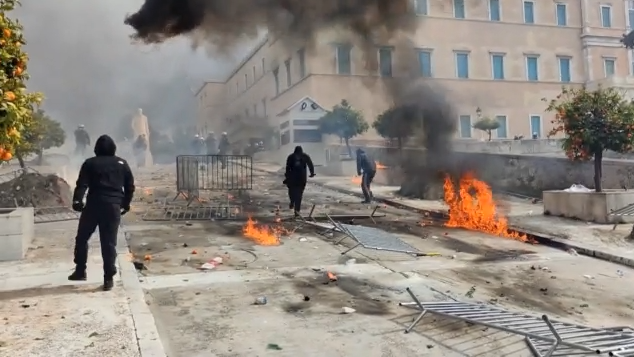 Είναι η στιγμή που ξεσπούν τα επεισόδια μπροστά από τη Βουλή. Λίγα μόλις λεπτά αφού έχουν τελειώσει οι ομιλίες των συγγενών των θυμάτων στο Σύνταγμα.