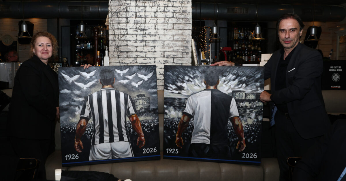 Στην κα Μαρία Γκοντσάρεβα και στον κ. Ηλία Πουρσανίδη προσφέρθηκαν οι εντυπωσιακοί πίνακες που είναι εμπνευσμένοι από τη διαχρονική σχέση των συλλόγων με τους φιλάθλους τους.