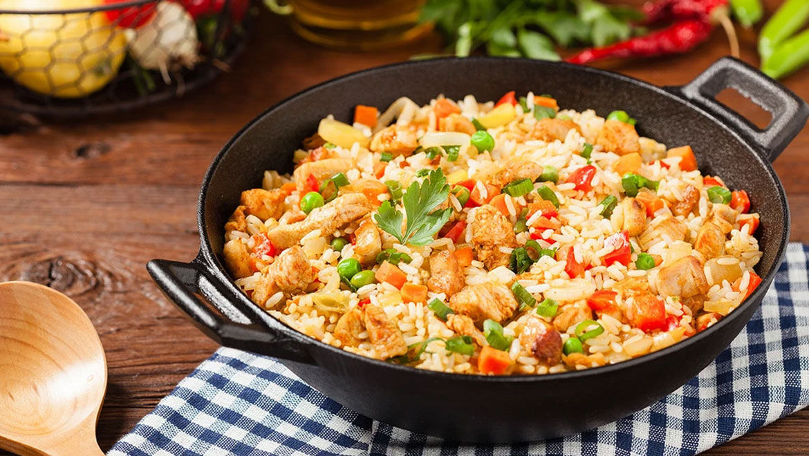 Προσθέστε το ρύζι, το κοτόπουλο και τα φρέσκα κρεμμυδάκια και ανακατέψτε καλά. Μαγειρέψτε για λίγα λεπτά ακόμα, μέχρι να ζεσταθεί το ρύζι.