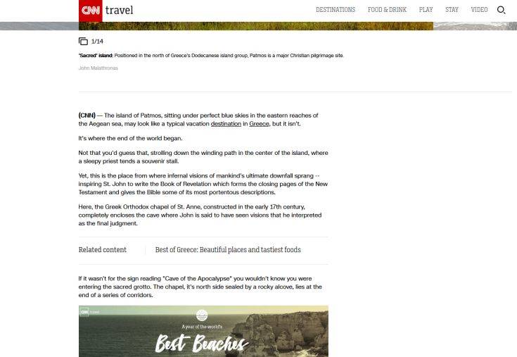 Με ένα μεγάλο αφιέρωμα τιμά το νησί της Πάτμου το CNN με τον χαρακτηριστικό τίτλο: «Πάτμος: Το ελληνικό νησί όπου άρχισε το τέλος του κόσμου». Ο δημοσιογράφος του δικτύου περιγράφει την εμπειρία του από το νησί και εξηγεί γιατί ενώ φαίνεται να είναι ένας τυπικός τουριστικός προορισμός… τελικά δεν είναι.