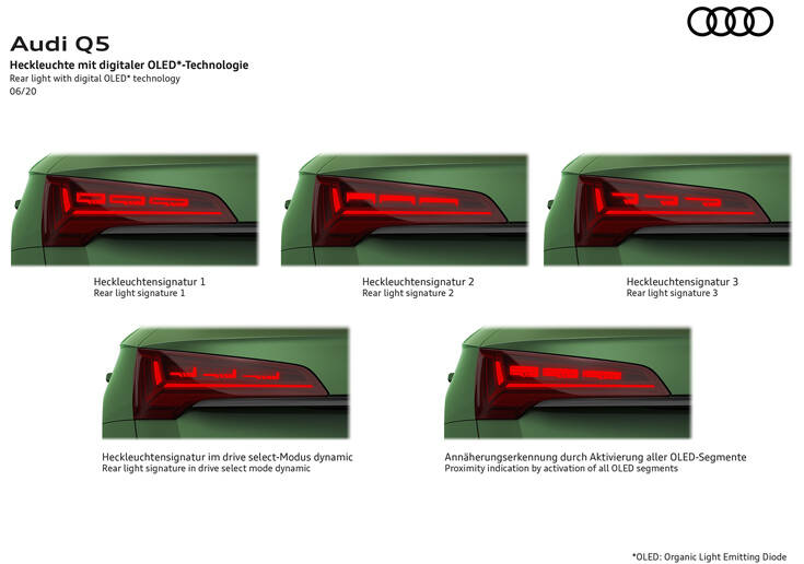 Η τεχνολογία φωτισμού OLED επόμενης γενιάς, είναι διαθέσιμη για πρώτη φορά στο ανανεωμένο Q5. Οι OLED είναι εξαιρετικά αποδοτικές οργανικές δίοδοι εκπομπής φωτός που δημιουργούν μια ομοιογενή επιφάνεια φωτός. Τα προαιρετικά οπίσθια φώτα OLED χωρίζονται σε τρία πλακίδια από έξι τμήματα το καθένα, το οποίο επιτρέπει στους σχεδιαστές και προγραμματιστές της μάρκας να δημιουργήσουν διαφορετικά σχέδια φωτισμού και υπογραφές από ένα μόνο υλικό. Κατά την παραγγελία, οι πελάτες του Q5 μπορούν να επιλέξουν από τρεις υπογραφές οπίσθιου φωτισμού, σύμφωνα με τις οποίες κάθε υπογραφή έχει τα δικά της ειδικά σχέδια στην άφιξη και την απομάκρυνση από το αυτοκίνητο.