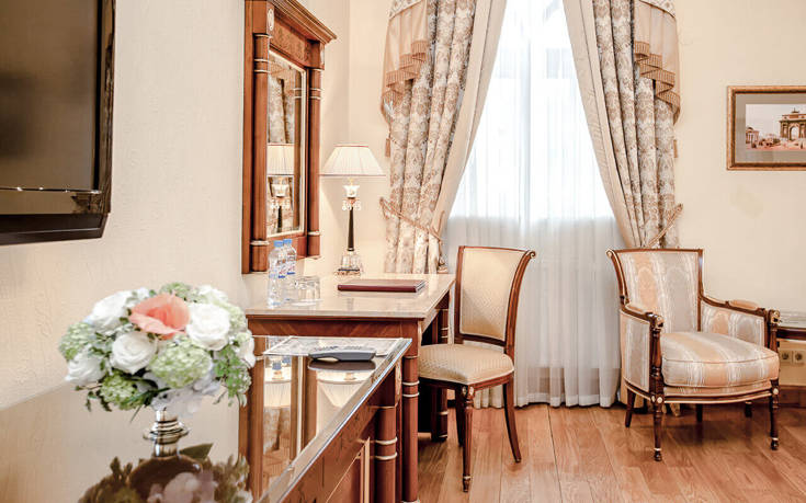 Μασίφ ξύλο, ζεστά χρώματα, χρυσά διακοσμητικά στοιχεία, πλούσια και «βαριά» υφάσματα, εντυπωσιακοί πολυέλαιοι και προσεκτικά επιλεγμένα χαλιά, καθιστούν τα 43 συνολικά δωμάτια και σουίτες του πραγματικά βασιλικά.