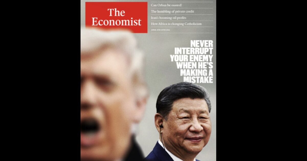 Ο Τραμπ φαίνεται να φωνάζει, με την εικόνα του να είναι θολωμένη, ενώ πίσω του ο πρόεδρος της Κίνας παραμένει ήρεμος και χαμογελαστός, με την εικόνα του στο πρωτοσέλιδο του The Economist να είναι πεντακάθαρη.