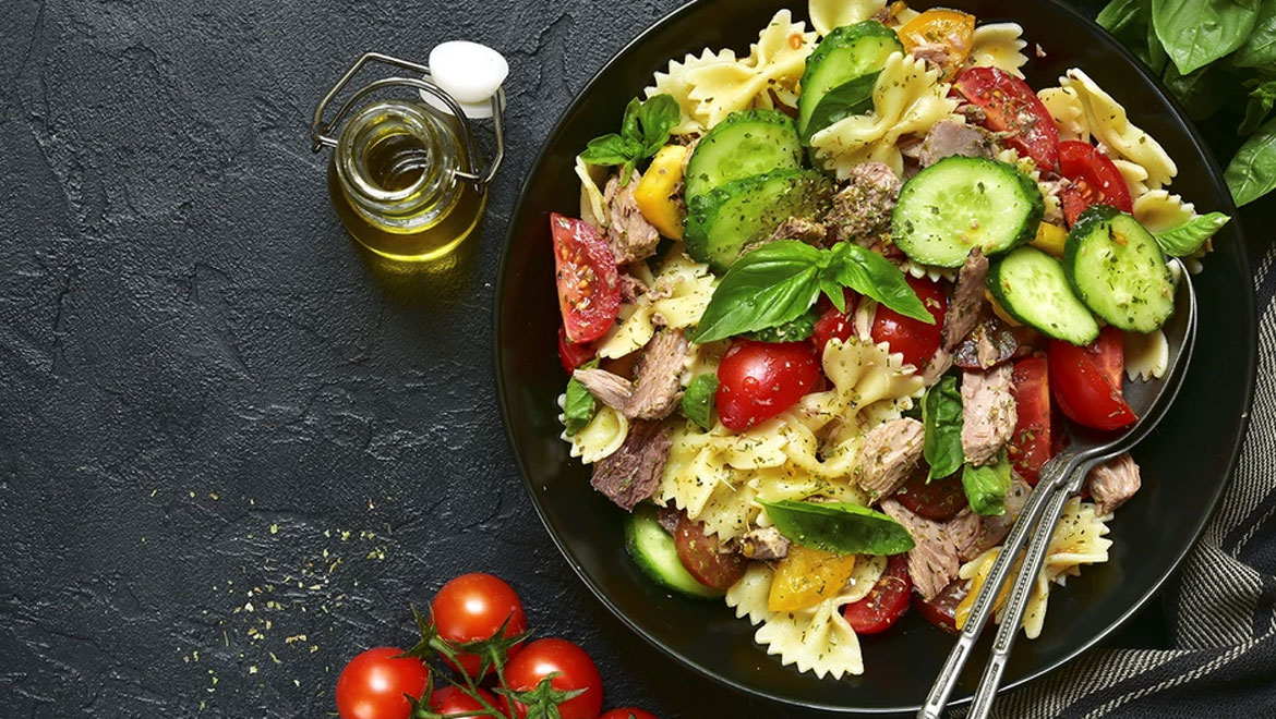 Βράστε τα ζυμαρικά σύμφωνα με τις οδηγίες της συσκευασίας, μέχρι να γίνουν al dente. Σουρώστε τα και στη συνέχεια περάστε τα κάτω από κρύο νερό για να σταματήσει η διαδικασία μαγειρέματος.