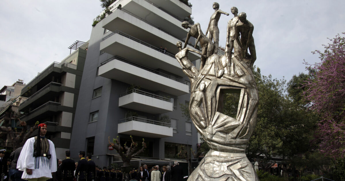 Στιγμιότυπο από τα αποκαλυπτήρια του μνημείου των ηρώων της ΕΟΚΑ στην Αθήνα, 4 Απριλίου 2014 (Φωτογραφία αρχείου / Γιώργος Κονταρίνης / EUROKINISSI)